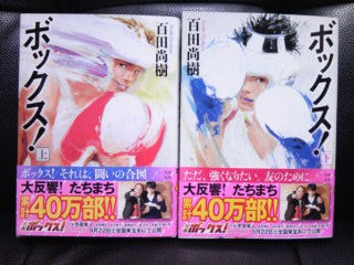 昨日のお昼?かな職場の休憩時間にちょうど亀田の前哨戦みたいのやってまして、まぁこれはプロボクシングなわけですが、対戦相手が元アマチュアの高校2冠とかインハイとか、小説中にも出てきた単語がでてくると楽しいです(゜▽゜;) 写真で分かると思うんですが、ヘッドギアもタンクトップも着てます。話は、プロボクシングじゃなくてアマチュアボクシングです。アマチュアボクシングと言っても、普通知らないので戸惑うかと思ったんですが、出てくる教師がボクシング素人ということもあり、担当のもう一人の顧問に質問攻めしてくれるので用語の解説はほぼ文中に出てきます。主人公の一人もボクシングを始めるストーリーですから主人公と同じ気持ちで読み進められました。 ちなみに「ボックス」という言葉は、「ボクシングをする」って意味 内容(「BOOK」データベースより) 上巻 アホでおちゃらけだが天才的ボクシングセンスを持つ鏑矢義平。彼の所属する恵比寿高校ボクシング部に幼なじみでいじめられっ子だった木樽優紀が入部した。特進コースで成績トップクラスの木樽の入部は周囲を驚かせる。木樽には強くなりたい理由があった。―大阪の下町を舞台に二人の少年の成長と挫折を感動的に描き出し全国の読者を感動の渦に巻き込んだ傑作青春小説、待望の文庫化。 内容(「BOOK」データベースより) 下巻 ボクシング部で憧れの鏑矢の背中を追って地道な努力を続ける木樽。周囲も驚く成長にともない鏑矢との関係には微妙な変化が忍び寄る。最後に勝つのは誰なのか!?女性教師・耀子、マネージャー・丸野、監督・沢木、孤高のライバル・稲村、個性的な部員たち他、多彩な人々との出会いを背景に少年たちの友情を感動的に描き出したスポーツ青春小説の金字塔!本当の強さとは何か。